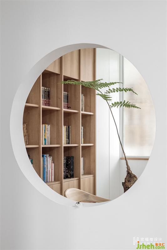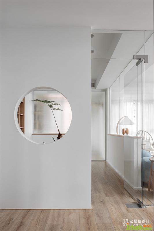 電梯到達(dá)7樓,打開大門正面迎來的便是將空間退移1060mm后呈現(xiàn)的圓形端景。景中擺放的金毛狗蕨,在陽光極佳的環(huán)境中,顯得特別有精神。這種悠然的環(huán)境令人放松和欣喜,也進(jìn)一步反應(yīng)出了“拾壹”家自然愜意的個(gè)性。