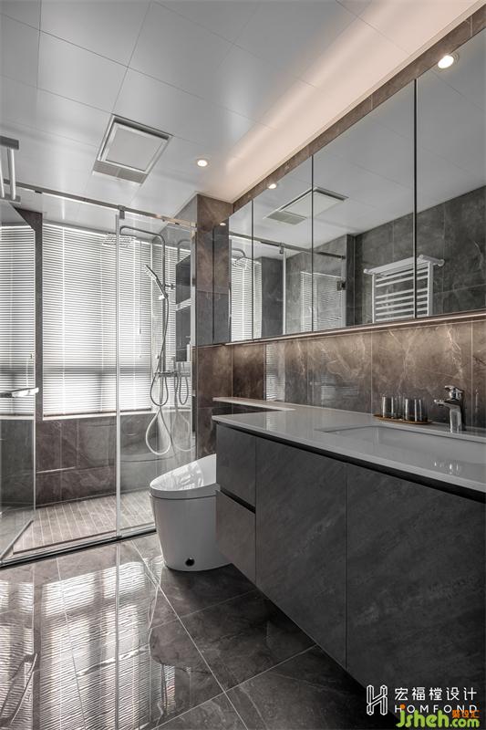 大地色系的大理石其天然紋理豐富空間的質(zhì)感,墻面與地板相互呼應(yīng)。一體式轉(zhuǎn)角臺(tái)面,加強(qiáng)使用的連貫性和方便性。橫向滿做玻璃柜,除了滿足女屋主存放各類化妝品之外,也在視覺(jué)上拉升了空間寬度。