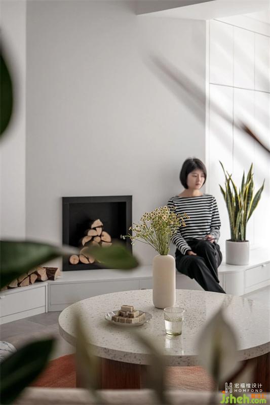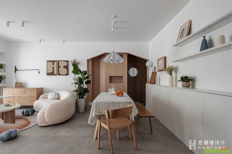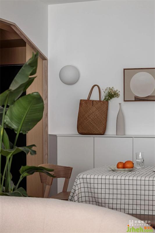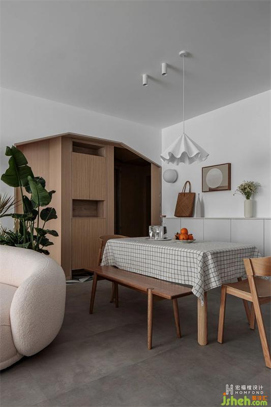 在滿足兩間臥室的實用和隱私性之后,打破客餐廳常態(tài)布局,呈現(xiàn)出靈活別致的有趣動線。以白鷺色為空間整體基調(diào),室內(nèi)材質(zhì)使用擁有溫潤屬性的天然木材、棉麻織物,適當(dāng)加入綠植,讓居住者在細(xì)膩而樸素的色系中,找尋到日常生活里最舒適、愜意的狀態(tài)。