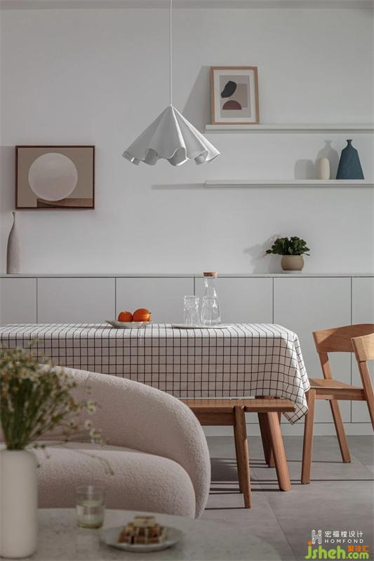 靠墻餐邊柜延伸至衛(wèi)生間轉(zhuǎn)角處,長度共4808mm,完善儲物功能定位。傘狀褶皺吊燈以及莫蘭迪色系裝飾掛畫、花瓶,豐富了空間層次,并為空間營造靈動、有趣的藝術(shù)氛圍。