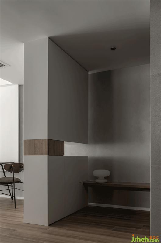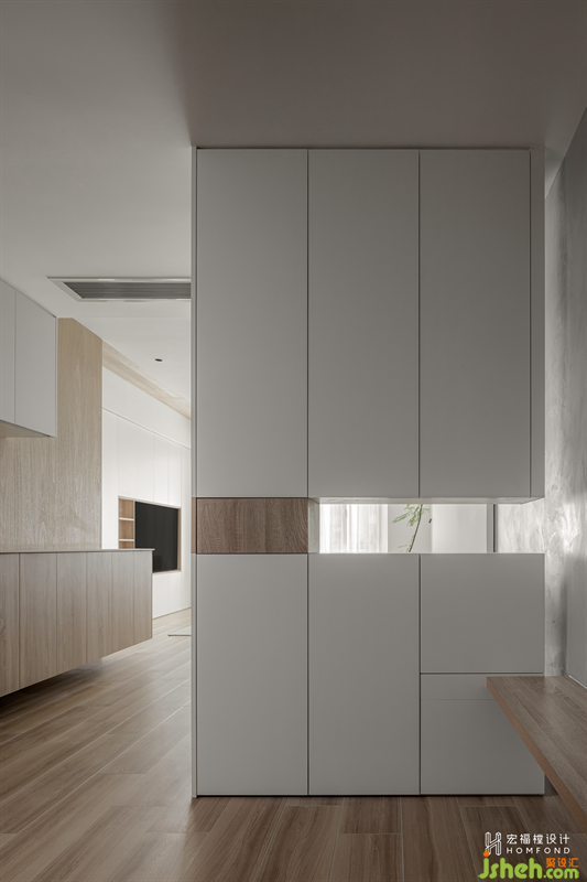 首先,利用白色與原木的自然力量浸潤出空間中的溫和感。然后,通過材質(zhì)的延伸和呼應(yīng)打破空間功能界限,運(yùn)用不同的體塊、形狀串聯(lián),形成一種趣味性的互動(dòng)設(shè)計(jì)。再將局部空間重新規(guī)劃,生活動(dòng)線進(jìn)行優(yōu)化處理后,把設(shè)計(jì)重點(diǎn)放在玄關(guān)這一短暫停留點(diǎn)上。讓它既是室內(nèi)外連接處,也是整個(gè)公共空間中的緩沖地帶。并利用光隙和空間的微妙關(guān)系,打造出一入戶便可窺見的“埋伏在建筑中的精彩場(chǎng)景”,從而喚醒居住者對(duì)家的即刻感知。