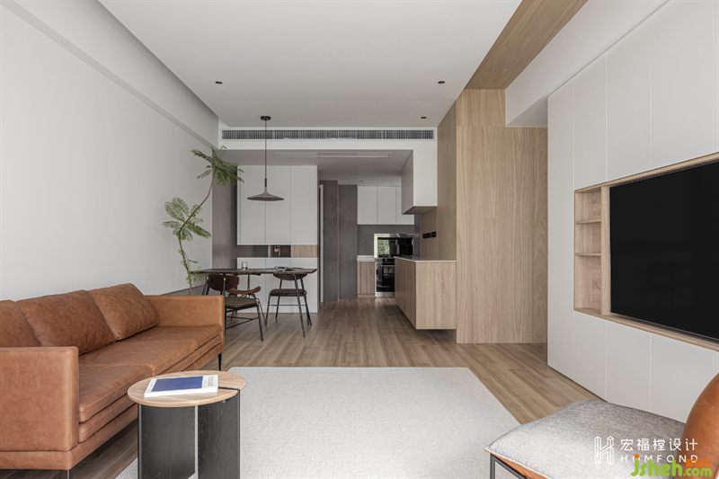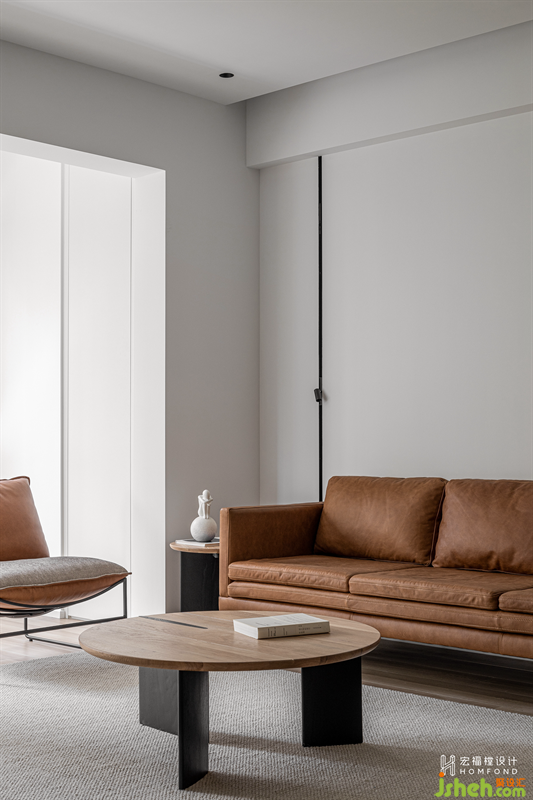 家居設(shè)計(jì)利用大小不同的幾何感體塊,為空間帶來視覺上的平衡秩序。對(duì)玄關(guān)儲(chǔ)物柜進(jìn)行細(xì)節(jié)尺寸的考量與把控,在坐下?lián)Q鞋的時(shí)候,即可通過故意留出的縫隙處“窺探”客廳全貌,并通過此舉讓身處在內(nèi)與外空間中的家人感受到溫暖的情感互動(dòng)。