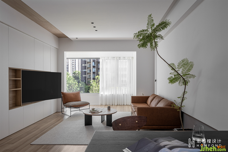 低樓層空間剛好能將外部種植的大樹一覽無遺,并以寬闊的窗戶作為媒介,將綠意引入。