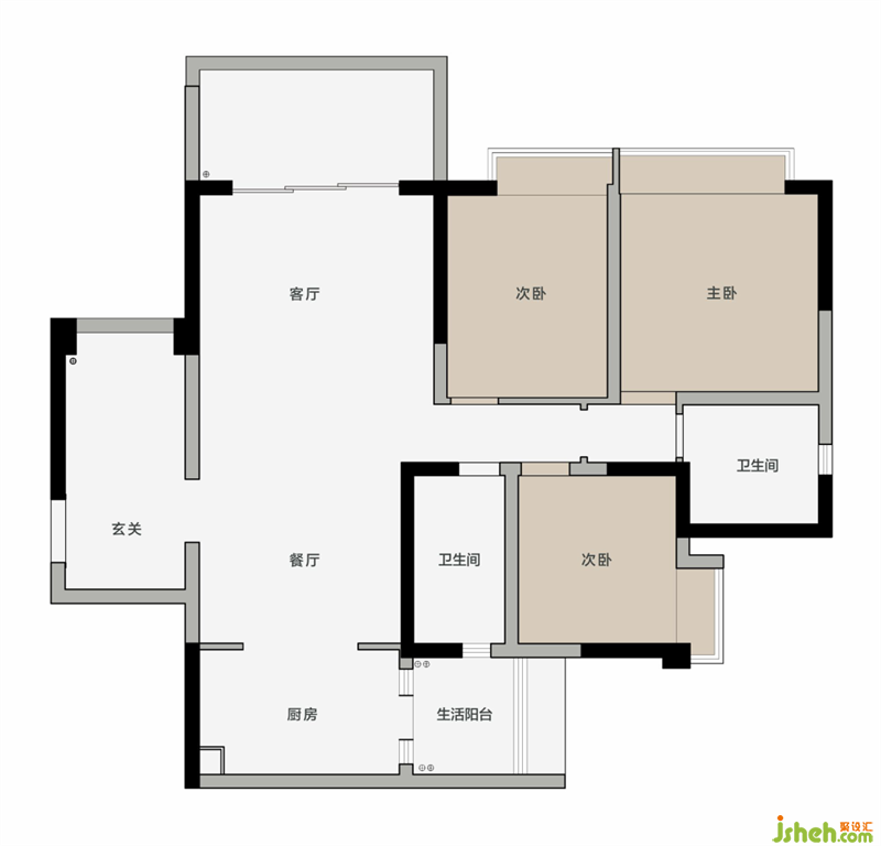 由于目前是兩人常住計劃三五年后再增加成員,于是我們根據需求反推戶型不做調整。兩間房完整保留,將重點轉到功能格局和動線的優(yōu)化上。