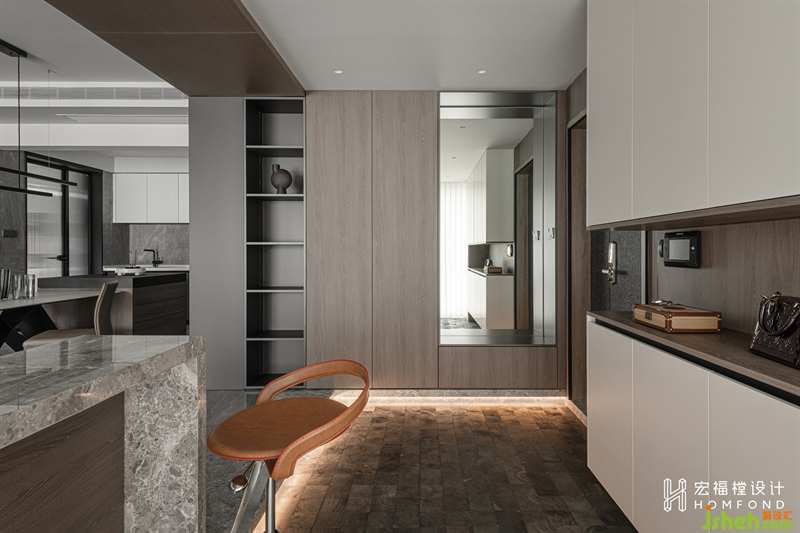 一進入室內就被入口處的層次感所吸引。原木飾面、極簡灰大理石、年輪紋理實木地板等三種材質結合,營造出一種頗高級的審美情趣。