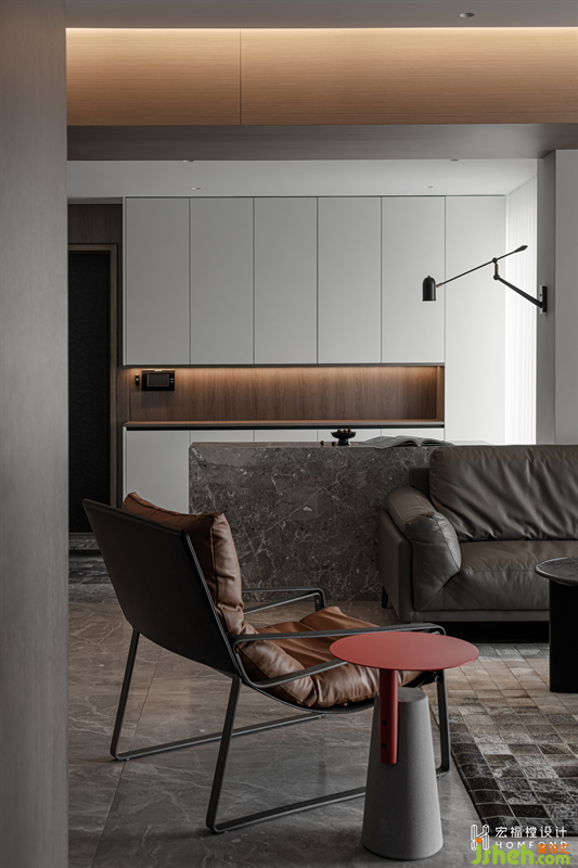 材質:運用相同材質穿插呼應、不同塊面構建差異,通過點線面的比例分割豐富空間形態(tài)。營造出符合居者審美情緒和生活哲學,硬朗、理性、簡約極致的舒適空間。燈光:全屋采用無主燈設計,通過不同燈光類型照亮不同區(qū)域,線性燈、洗墻燈、深照式筒燈的結合使空間整體營造出舒緩、愜意的氛圍感。色彩:以極簡灰為主色調、佐以木色輔助、藍、橙、紅色塊點綴,為冷靜的空間注入情緒溫度,渲染出時尚、靈動、舒緩愜意的空間感受。