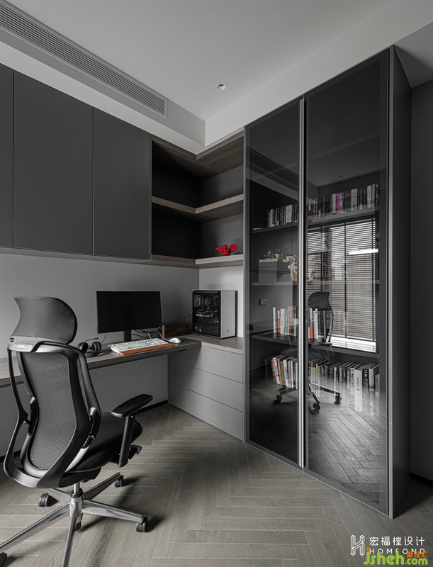書房整體大氣時尚,體現(xiàn)了屋主沉穩(wěn)、不拘一格的氣質(zhì)品味。細(xì)長型的結(jié)構(gòu)中,打造出一個兩層夾角收納區(qū)域恰好能滿足屋主居住日常的使用需求。