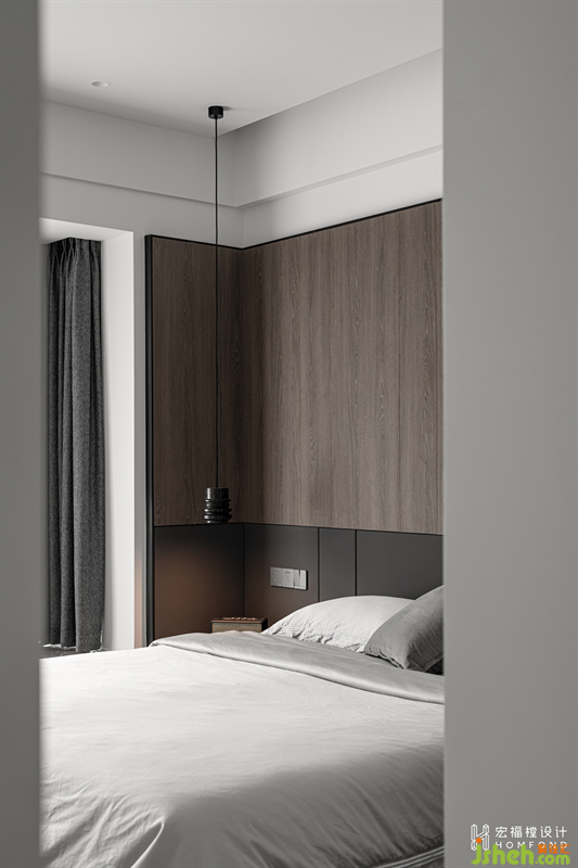 空間延續(xù)極簡灰作為主色調(diào),淺色緞面床品提升整體調(diào)性,去繁就簡,營造舒緩靜謐的入睡氛圍。天然木飾面的加入,為空間注入自然生命力,回歸純粹的居住屬性。