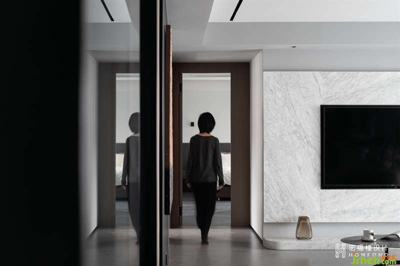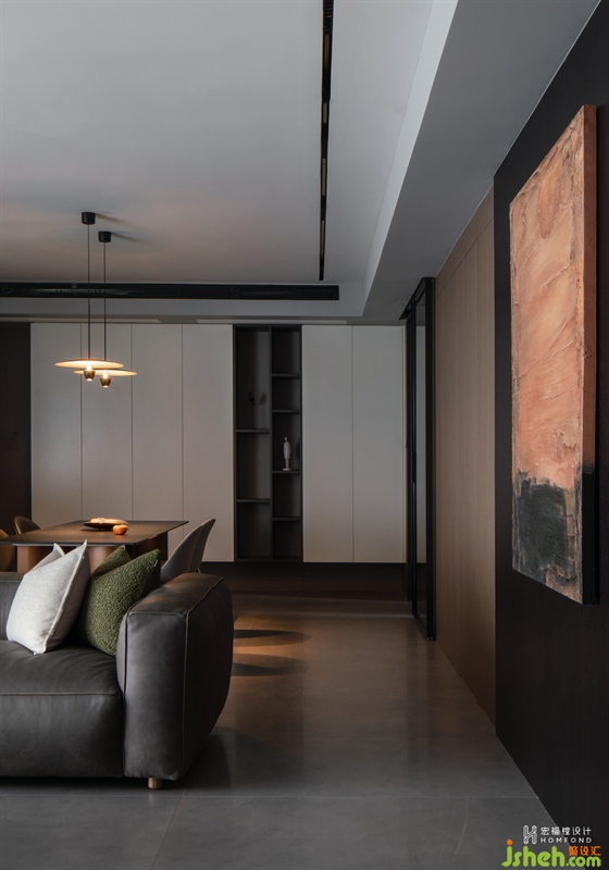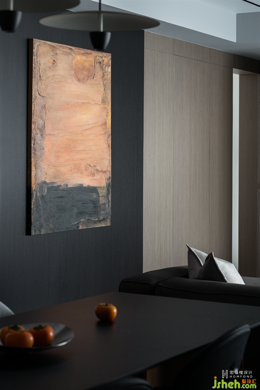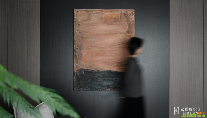 作為公共空間中的緩沖地帶,走廊以延展視覺和氛圍呈現(xiàn)。一幅抽象手繪畫,與背景木皮材質(zhì)糅雜出多種感官體驗。在游走與停留之間,具象與抽象進(jìn)行多元敘述。