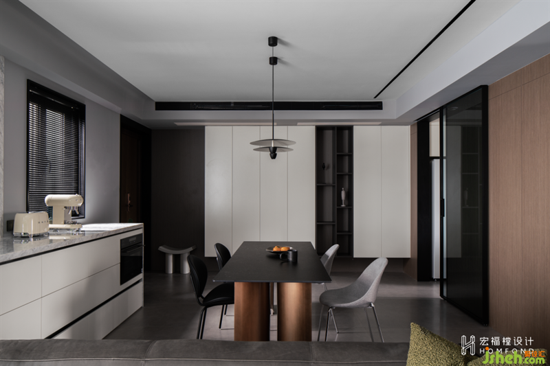 定制餐廳邊柜,充當(dāng)屬于兩人的咖啡吧臺,這樣貼近生活的居家設(shè)計讓心情倍感愜意,是獲取幸福的重要途徑,也是設(shè)計師傳遞給居住者的重要概念。