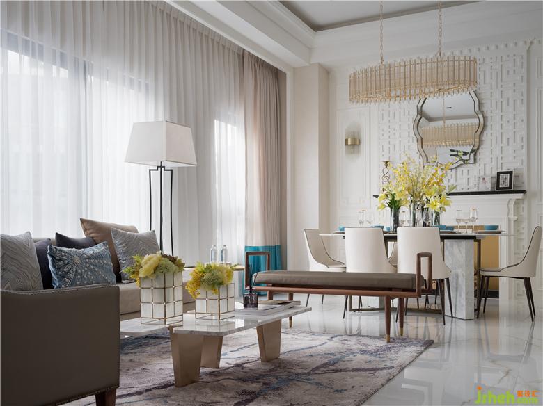 以米白色為主色調(diào),點綴些金色圍塑輕奢優(yōu)雅的質(zhì)感,搭配屋主喜愛的孔雀藍(lán)色調(diào),鋪敘華而不奢的時尚新古典。穿過深咖啡色大理石門斗,開闊視感浮現(xiàn)于眼前,瞬間能感受到明亮采光的雅致公領(lǐng)域,每個家具軟件都是精心挑選搭配過后的成果,由低至高低調(diào)塑造層次感,餐廳主墻以東方韻味的客制紋路與線板交織,搭配西式線條造型鏡面及絢爛高雅的水晶燈,映襯出華美時尚的清麗風(fēng)情。裝修公司