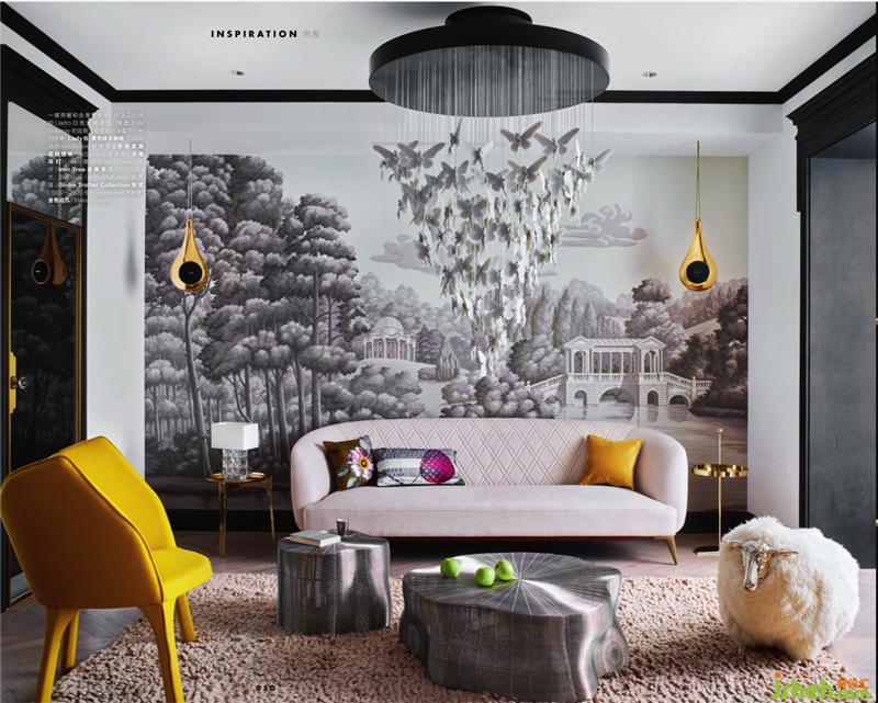 于是可以看到,一樓會(huì)客廳來(lái)自意大利Garvan的水滴形音響和背后的de Gourney 風(fēng)景壁紙構(gòu)成了一副令人遐想的畫卷。坐在這里就好像在森林里聽(tīng)音樂(lè)藝術(shù)吊燈上如瀑布般垂吊的小精靈閃爍的光芒,而靈感就開(kāi)始在心里的某個(gè)角落萌發(fā)……