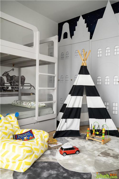 小主人昵稱“城堡”,設(shè)計師就為他定制了一座城堡衣柜,屋頂和每扇小窗都內(nèi)置了暖光,點亮?xí)r見光不見燈,很有氛圍感。