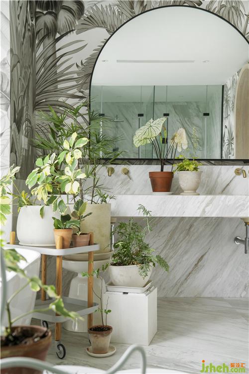 舞動的樹影、壓滿枝頭的艷麗花朵、盛夏傍晚在叢林里聚會的鳥雀和動物們,構(gòu)成了Ada關(guān)于海島度假的另一重印象,直面自然的親近感始終讓她念念不忘。設(shè)計師將自然元素散布在家中,植物壁紙、鮮活的綠植盆栽和鮮切花,穿插在各個角落。棕櫚葉圖案的壁紙搭配一室的綠植,如花草仙境般的主臥浴室,意境美好。