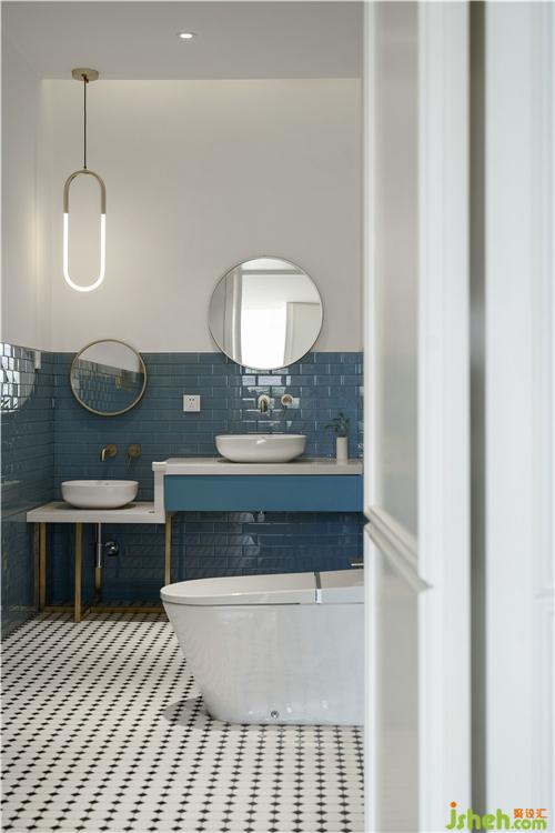 兒童房半墻瓷磚搭配藍(lán)色浴室柜,打造出了一片深邃海域,愜意而時髦。