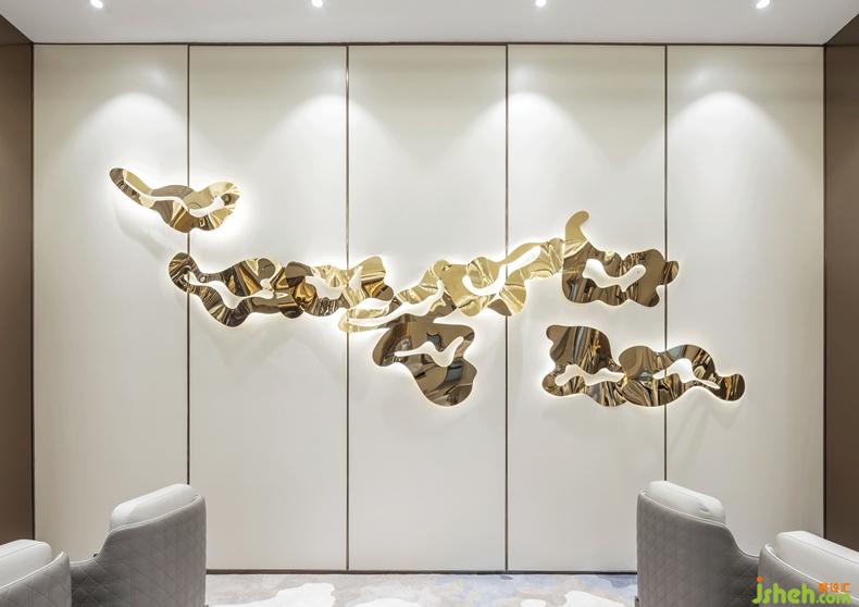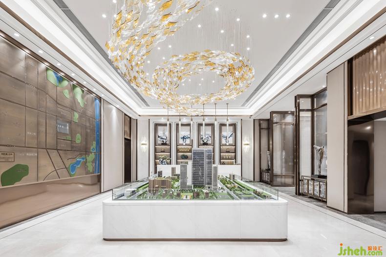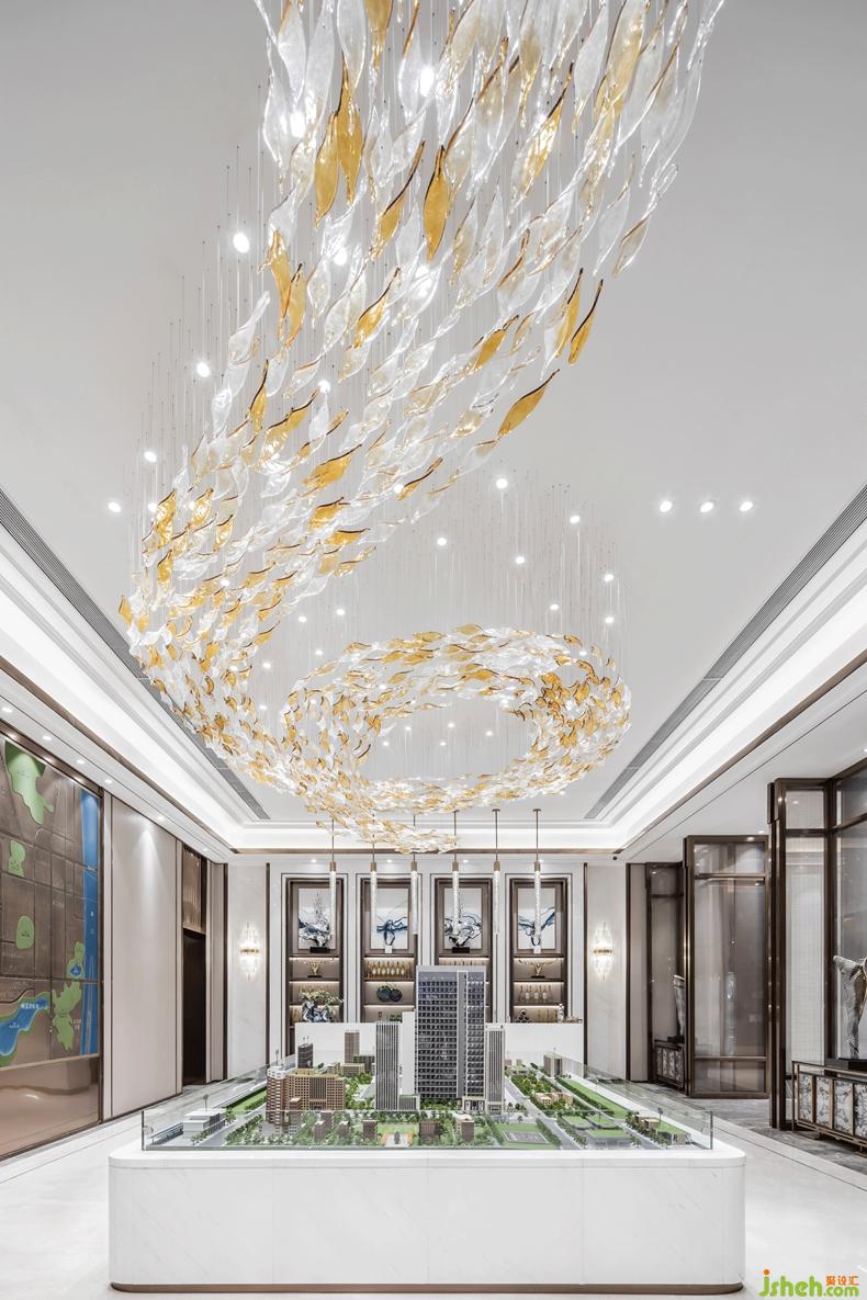 再入,真正帶來視覺沖擊的是沙盤模型區(qū)和洽談區(qū)的藝術燈具造型,不僅模擬了湘江的動態(tài)美,室內設計師運用湘江之水的藝術形態(tài),局部點綴跳躍橙黃色,賦予空間更加形象生動的生機感和空靈意境,給整個空間帶來一種和諧生態(tài)的審美體驗。