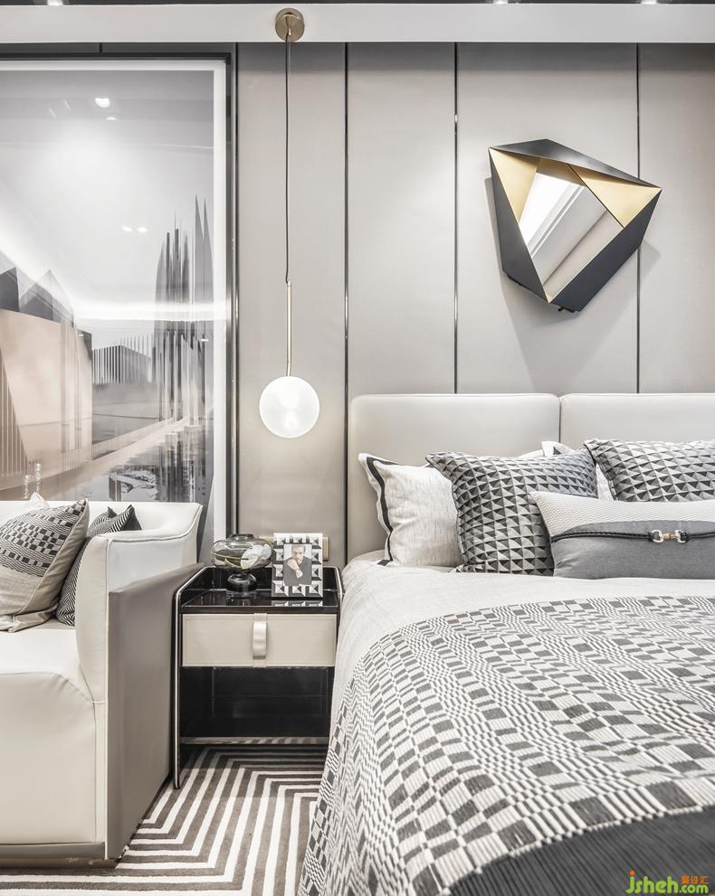 室內(nèi)設(shè)計(jì)師創(chuàng)作中最為巧妙的一點(diǎn)是利用衣柜隔斷空間,并根據(jù)元素的不同區(qū)分差異性;客廳所具有的規(guī)整性嚴(yán)謹(jǐn)感,都是通過建筑畫、幾何紋理、威士忌酒文化所打造出來的奢華高雅,不同于至簡(jiǎn)至奢的入口處,也不同于悠然隨性的臥室。
