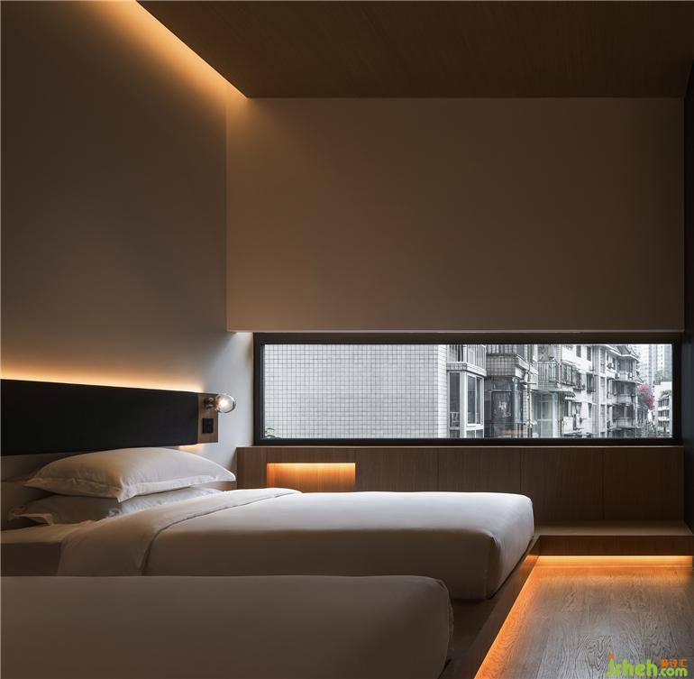 內(nèi)院的客房以條窗的形式,重新整理了窗外的景色,設(shè)計(jì)師酒店設(shè)計(jì)無論是城市的樓群亦或是小區(qū)的園林,都以一種更精致的形式映入室內(nèi)。