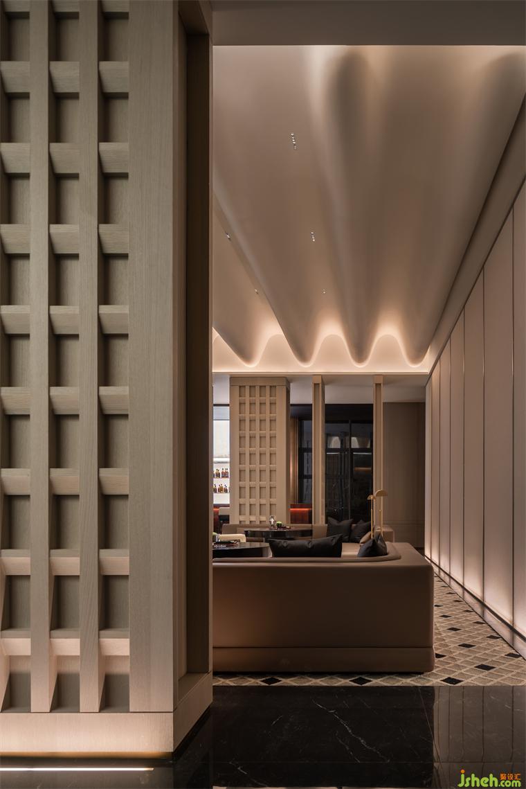 利用原建筑條件的場地高差,西安營銷中心設(shè)計接待前廳區(qū)形成了相對下沉的內(nèi)斂情緒。薄透的絹布絲綢營造的“虛”、渾厚的古銅鋼制造的“實”,人們行走在如水、如鏡的地面,接受著全然沉浸式的空間體驗。