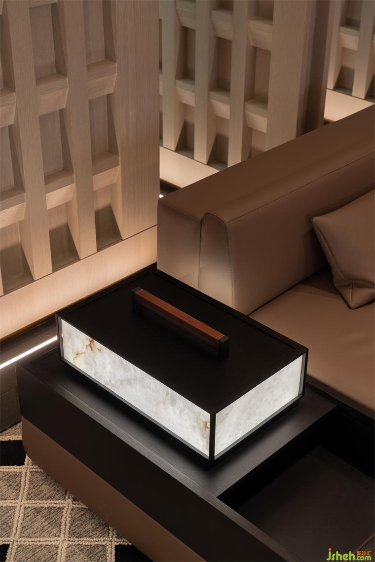 一扇紅色的漆皮質(zhì)長桌,居中而立,取色經(jīng)典的捫皮疊加亮光漆,在柔和的木色中聚焦人們的視線,展現(xiàn)空間尺度與品質(zhì)營造的本身。