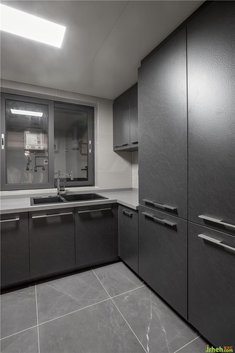 廚房始終追求的是干凈,整體依然選擇一體式定制設(shè)計(jì),灰色安靜色。櫥柜為多開門的設(shè)計(jì),大方簡明。