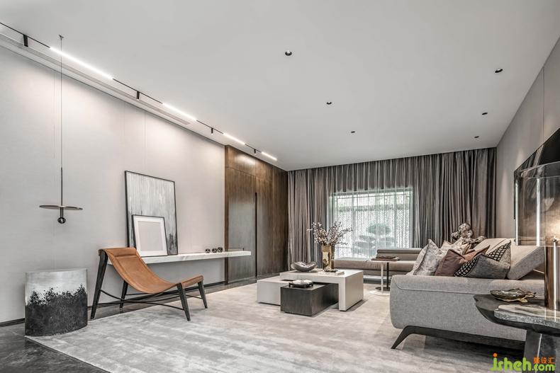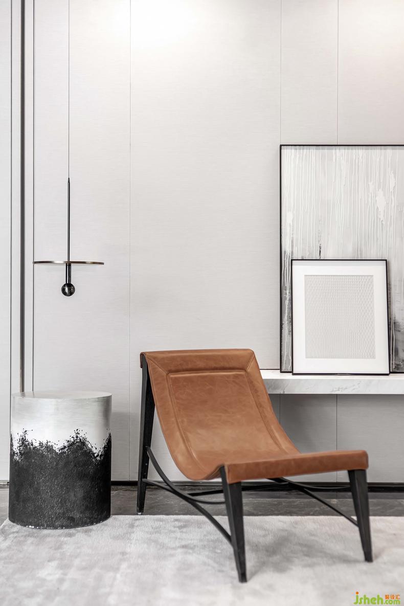 低飽和色調(diào)墻面點綴黃銅邊框呈現(xiàn)出高品質(zhì)生活氣息。兼顧實用性與舒適性的橙色皮質(zhì)躺椅搭配灰色絨毛地毯,舒適的觸感、清新的配色,塑造別樣的居住美感。別墅裝修設(shè)計