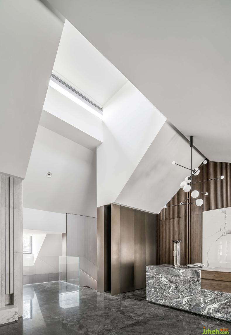 樓梯旁開合性更強(qiáng)的空間,連通室內(nèi)與室外,引入了更多的自然光。空間縱橫貫通,視野通透而開闊。