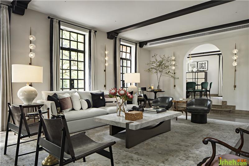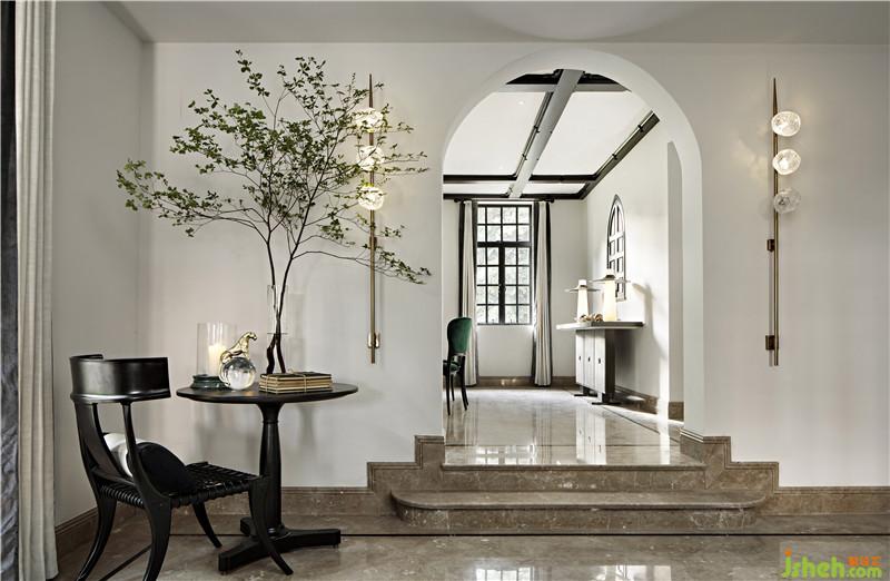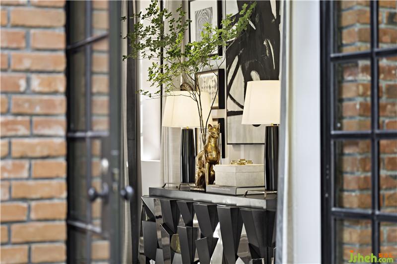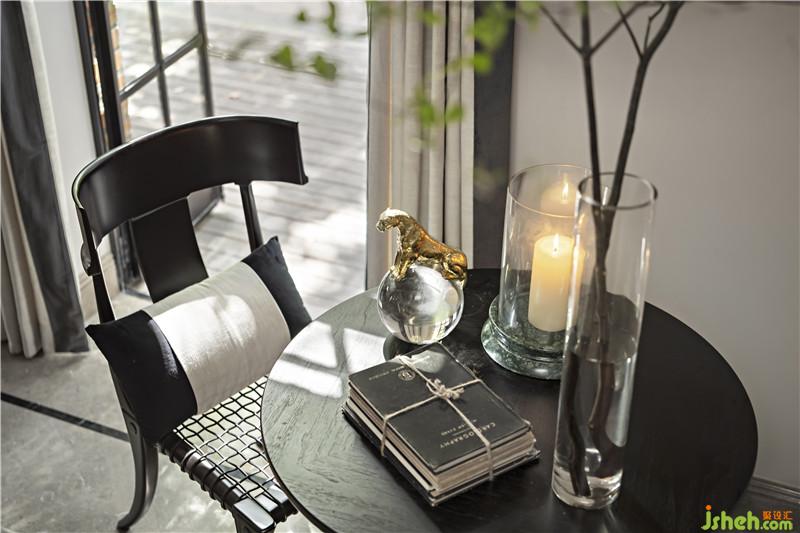 起居室背景展示墻,以混搭風(fēng)格鋪陳出洛普普的敘事展現(xiàn)。原始的羚羊頭飾,彷若征服野性蠻荒,象征勝利光輝。鑰匙是正在延續(xù)著的權(quán)勢(shì)標(biāo)志。設(shè)計(jì)師用跳色的編織盤與抽象藝術(shù)畫將微量的彩色疊加進(jìn)黑白灰的間隙中,呈現(xiàn)出別樣、細(xì)膩的風(fēng)情。而左下角的守護(hù)貓,一如埃及傳說(shuō)中神秘的幸運(yùn)守護(hù)者,正看顧著明亮通透的窗外,不斷朝曦夕映的美好時(shí)光。別墅裝飾