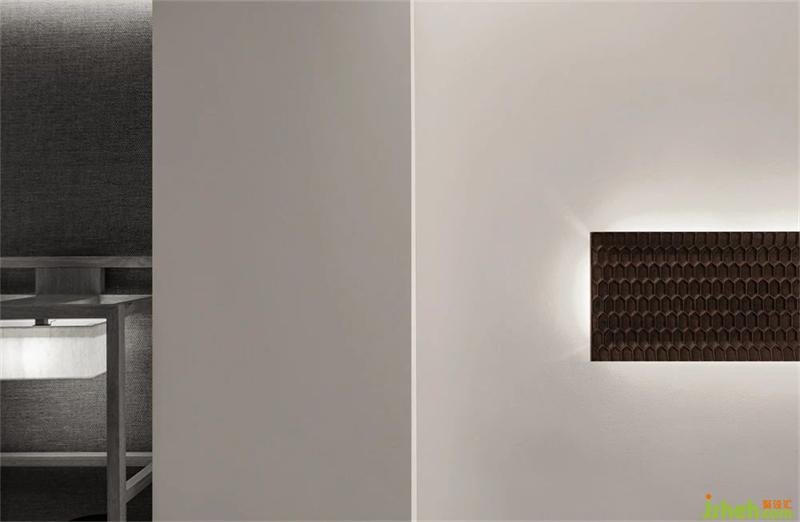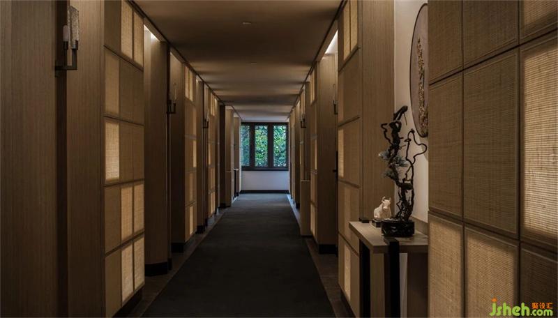 客房走道結(jié)合現(xiàn)有的建筑墻體形態(tài),通過凹凸形體的構(gòu)成關(guān)系,運(yùn)用藤編和燈光的組合,營造除質(zhì)樸且細(xì)膩的通道氛圍。
