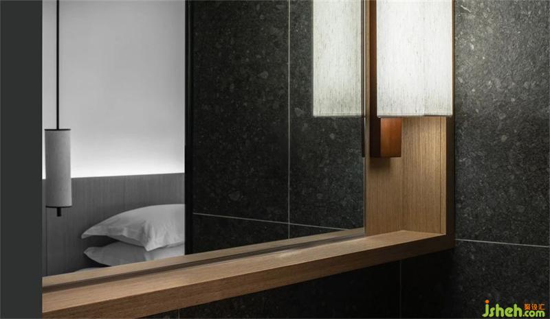 客房室內(nèi)空間造型運(yùn)營幾何手法進(jìn)行切割,簡潔利落。通過光滑的白色涂料和質(zhì)樸編織墻布形成對比帶來視覺上的賞心悅目。