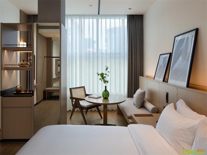幾何是抽象、擁有無限可能性的元素單位。酒店設計幾何的線條在立面組合,不同的肌理產(chǎn)生對比,賦予建筑簡潔明朗的幾何之美。從建筑的立面延伸至內(nèi)部空間,錯落的幾何關系在形與形之間回應著一種輕松的連接與分布邏輯,簡單的形體在小空間內(nèi)創(chuàng)造空間啟與承,如此輕盈,輕快明朗。
