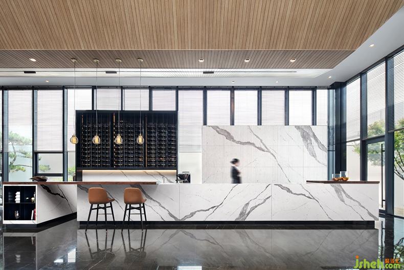 接待總臺(tái)與水吧區(qū)合二為一,不同材質(zhì)與紋理經(jīng)過別出心裁的組合,凸顯質(zhì)感與品味。