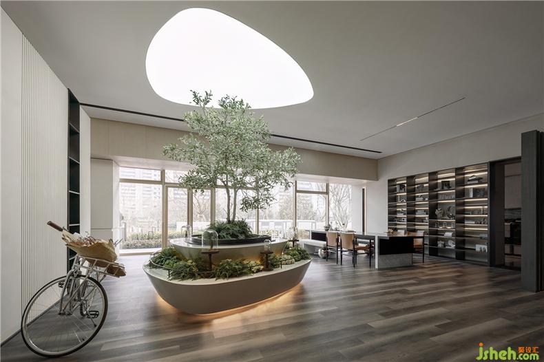 將銷售中心作為城市社區(qū)生活的縮影,從傳統(tǒng)單一功能的銷售模式中跳出來,向多元復(fù)合的未來體驗(yàn)中心轉(zhuǎn)變。除傳統(tǒng)的銷售洽談功能外,還涵蓋了輕餐、咖啡、書吧、手工、花藝、兒童娛樂、書法交流、辦公等多元場(chǎng)景單元,室內(nèi)設(shè)計(jì)師豐富的可變性和場(chǎng)景融合性成為空間的亮點(diǎn)。
