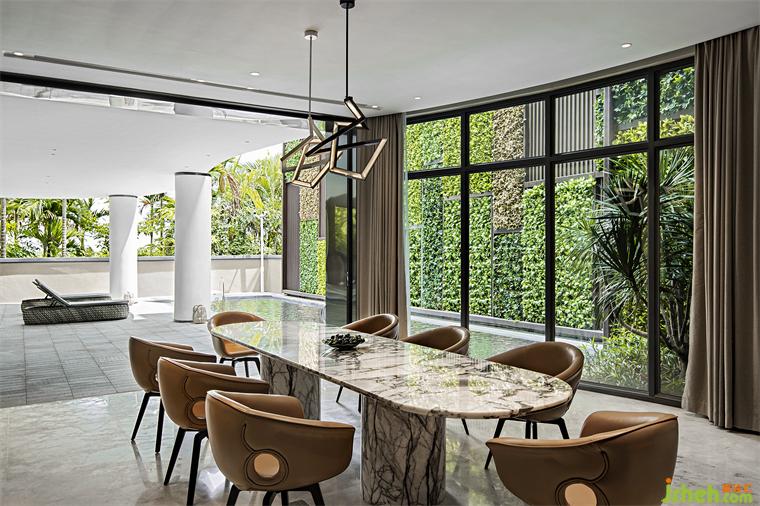 社交中空客廳、西式餐吧、私人影院、酒窖、健身室等功能圍繞著露天泳池展開,各空間之間沒有明顯的界限,彼此形成通暢的流動(dòng),不同生活場(chǎng)景自由切換。