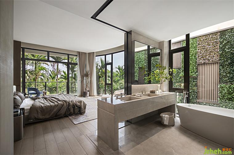 每間臥室皆配置觀景浴缸,設(shè)計師打破浴室的固有格局,別墅裝飾模糊浴室與居室的邊界,居者可在房間里靜聽風(fēng)吹椰林,在香薰與音樂中深度放松,在自然的寄語里感受浪漫優(yōu)雅的品味。