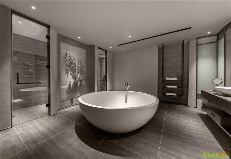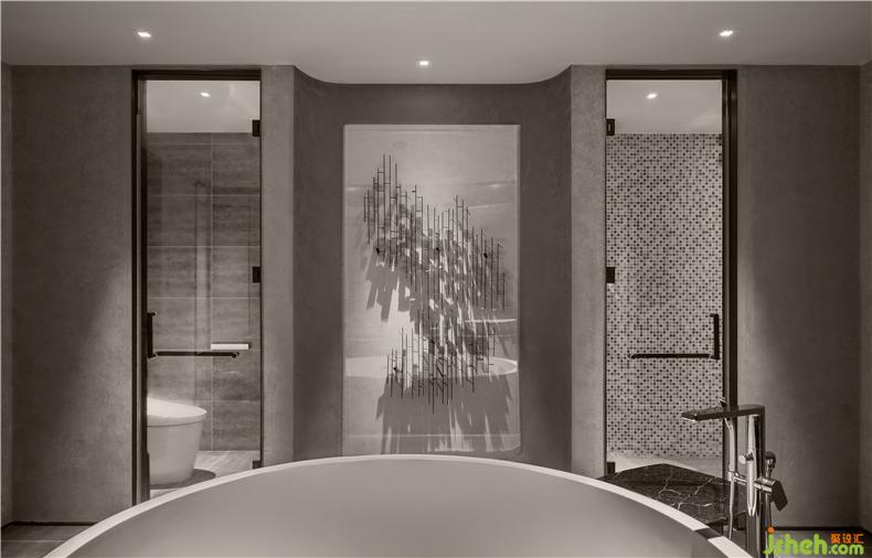 簡約的型體,輕盈靈動,清透空曠區(qū)域,就好比紗質(zhì),在沉重的空間帶來呼吸感,使空間活起來。衛(wèi)浴間雖是最隱秘的區(qū)域,卻是最能令人放松的空間。沐浴間配有精美妝面鏡,使視覺上變得更加明亮寬敞。會所設(shè)計墻面凹處掛著一副創(chuàng)意金屬壁飾,在燈光的映射下,讓浴室空間在沉凈素雅中而不失靈動。盥洗間的臺盆處,造型獨特的金屬玻璃吊燈,精致而細(xì)膩,從細(xì)節(jié)體現(xiàn)出設(shè)計者對高品質(zhì)生活的追求。