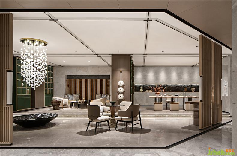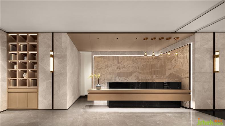 接待處作為整體“場所”的入口,協(xié)調(diào)空間整體的一致性,樣板房設計方正簡明將各功能區(qū)進行勾勒劃分。大面積材質(zhì)鋪陳與去裝飾化明確了空間的節(jié)奏韻律,前臺背景雕塑構成了文化底蘊輸出的情感鏈接點,隱約雀躍著深圳這座城市歷史文化和山水之間的聯(lián)系。