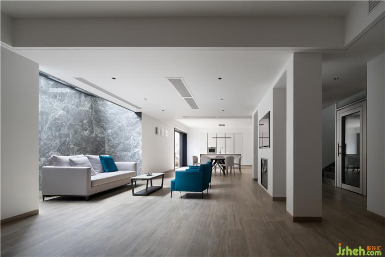 色彩上,藍(lán)色的加入,與整體的灰白色調(diào)共同營造出輕奢的質(zhì)感。