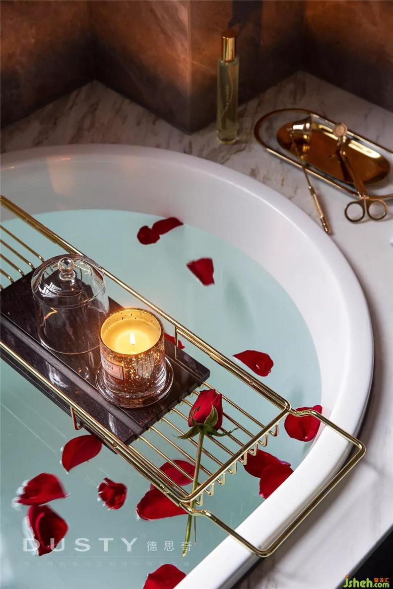 玫瑰花瓣,香薰燭臺, 帶去了家門外的疲憊與喧囂,此刻只有美好。主衛(wèi)的空間并不大大,因而潔具都是嵌入式的,同時方便后期衛(wèi)生的打理。
