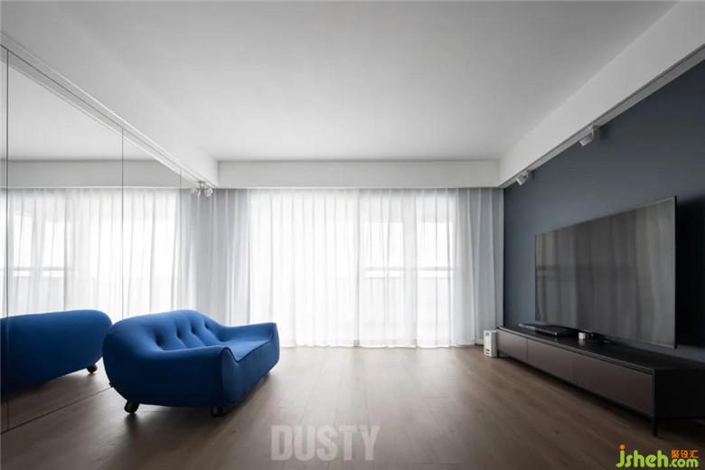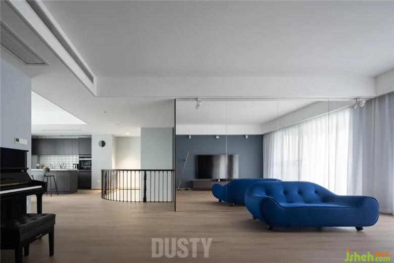?木質(zhì)地面、深灰色墻面、超大的落地鏡構(gòu)成了二樓的家庭廳。藍(lán)色的沙發(fā)讓原本素凈的空間更添一份優(yōu)雅氣質(zhì)。