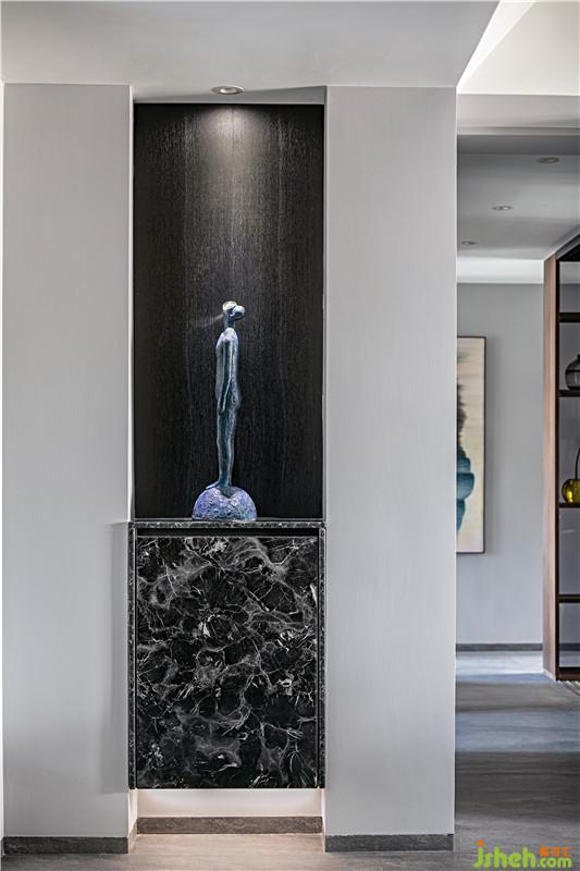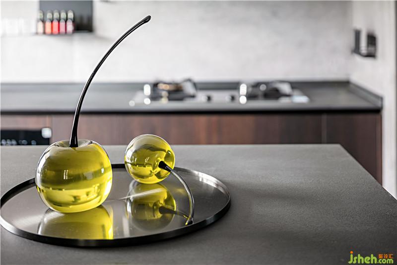 灰色從客廳貫徹到廚房——意大利LAMINA太空黑至純廚臺(tái),以及意大利LAMINA銀豹洗手臺(tái),還有水泥灰大磚墻等營(yíng)造出廚房工業(yè)風(fēng)粗糙厚重的質(zhì)感,整個(gè)空間的氣質(zhì)——藝術(shù)、帥氣、野性。