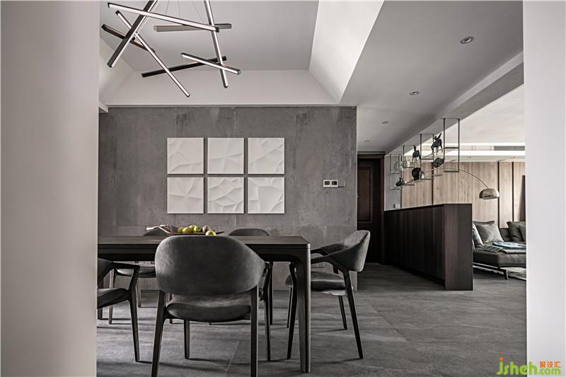 餐廳與客廳銜接,空間關(guān)系一目了然。整體空間層高2.7M,裝了中央空調(diào)后為2.4M。為了在視覺(jué)效果上拉伸層高,避免空間局促,餐廳主墻與地磚都是采用1500*700CM的大磚錯(cuò)縫鋪貼。