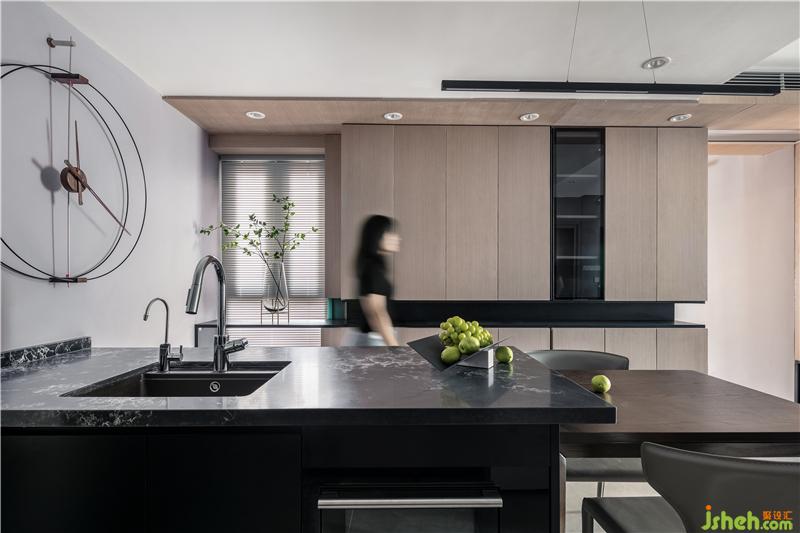整面墻的電視柜與飄窗書柜相連,為避免緊湊感覺,設(shè)計(jì)了一塊比較大的間隔空間放置一個抽象化人物雕塑,做為空間的聚焦點(diǎn);非具象化的人物雕塑,如同業(yè)主不想被定義化、標(biāo)簽化的個人屬性。無拉手的柜門設(shè)計(jì),營造出客廳干凈整潔的視覺觀感!裝修設(shè)計(jì)