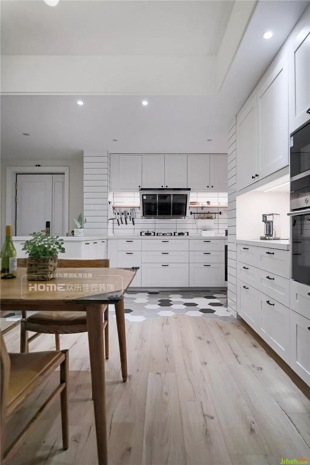 黑白灰的六角磚從入戶一直延續(xù)到廚房,空間的連接性和延伸性得以最佳的展露。色彩單一的臺面和櫥柜,可以置放濮先生的茶愛好,也不至于搶了客餐廳的風(fēng)頭,反而增加了融入感。