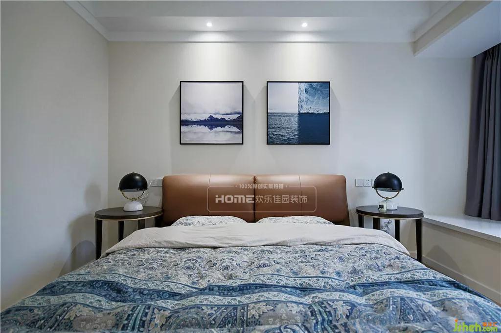 主臥精心挑選了一款棕色皮質(zhì)雙人床,輔以品質(zhì)感滿滿的印花床品,實(shí)用性和美觀性相得益彰。由于樓層不高,外面的綠植影響到室內(nèi)的采光,因而需借助大面積的飄窗和光源提升亮度。