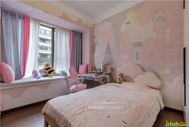 女兒房除了考慮基本的睡眠和收納功能,,在窗口光線好的地方,安排了寫作閱讀的書桌,,俏皮可愛的墻紙和粉嫩云朵床是絕配,,一盞小燈,各種玩具讓夜晚更加溫馨。