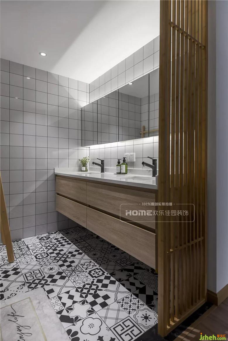 原房兩個衛(wèi)生間是緊挨著的,打通其中一個衛(wèi)生間的隔墻,劃分為獨(dú)立的洗漱區(qū)域,用復(fù)古的白磚與不規(guī)則圖案的花磚鋪貼墻面與地面,竹制的鏤空隔斷,半透明的效果,給空間增添一絲清幽感。