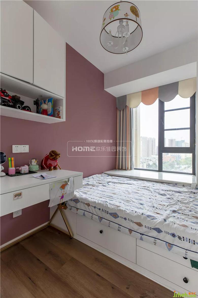 女兒房布置成榻榻米加書(shū)桌一體化,床下是收納空間,充分達(dá)到小空間大收納的效果,加入了俏皮的軟裝單品,粉色的墻漆,無(wú)一不為小孩子的起居空間增加溫柔度。