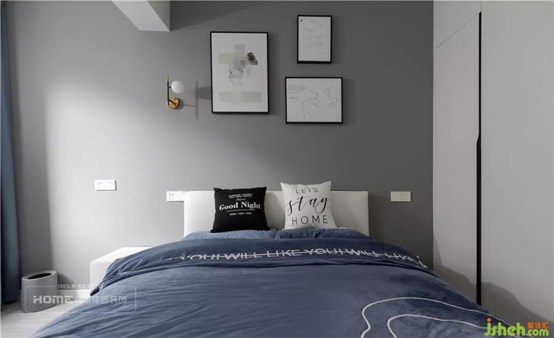 次臥藍(lán)+灰為主色調(diào),北歐風(fēng)掛畫組合有別樣的簡(jiǎn)約之美,頂天立地柜增加收納空間,清新低調(diào)的家居單品更有助于睡眠,給人靜謐放松之感。