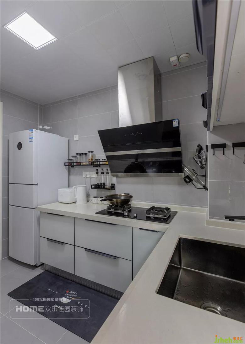 廚房整體干凈利落的白色,充足的櫥柜空間收納不常用的物品,保證生活的有條不紊,L形操作臺(tái),兩個(gè)人剛剛好的動(dòng)線,右邊:水槽-洗菜,左邊:切菜-烹飪。